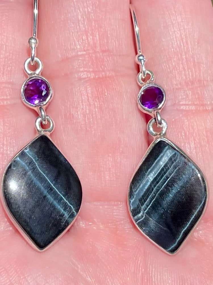 Blue Tigers Eye (Hawk’s Eye) and Amethyst Earrings