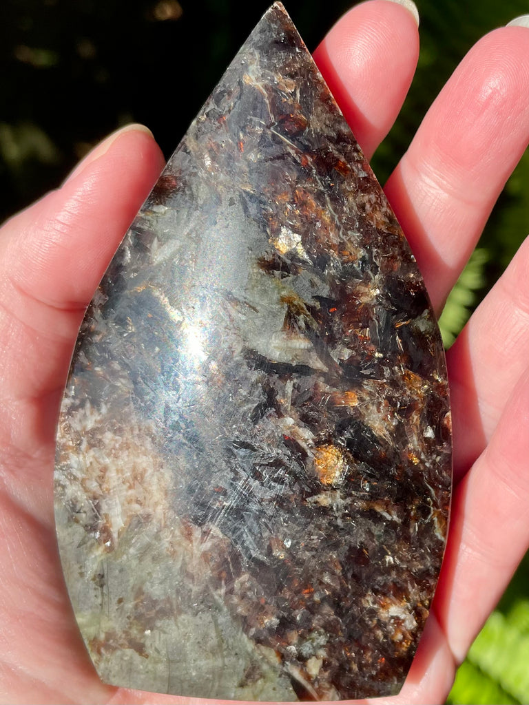 The name "Astrophyllite" comes from the Greek "astron" for "star" and "phyllon" for "leaf" due to its starburst-like sprays. Astrophyllite helps to release old patterns and programming without any guilt so that forward progress can be made. It assists and guides one to reaching one’s full potential, allowing for the recognition/realization that there truly are no limitations or obstacles. Physically, Astrophyllite works with issues of the hormonal and reproductive systems, including PMS and menopause issues. It can also be used in the areas of cell regeneration, epilepsy and the large intestines.