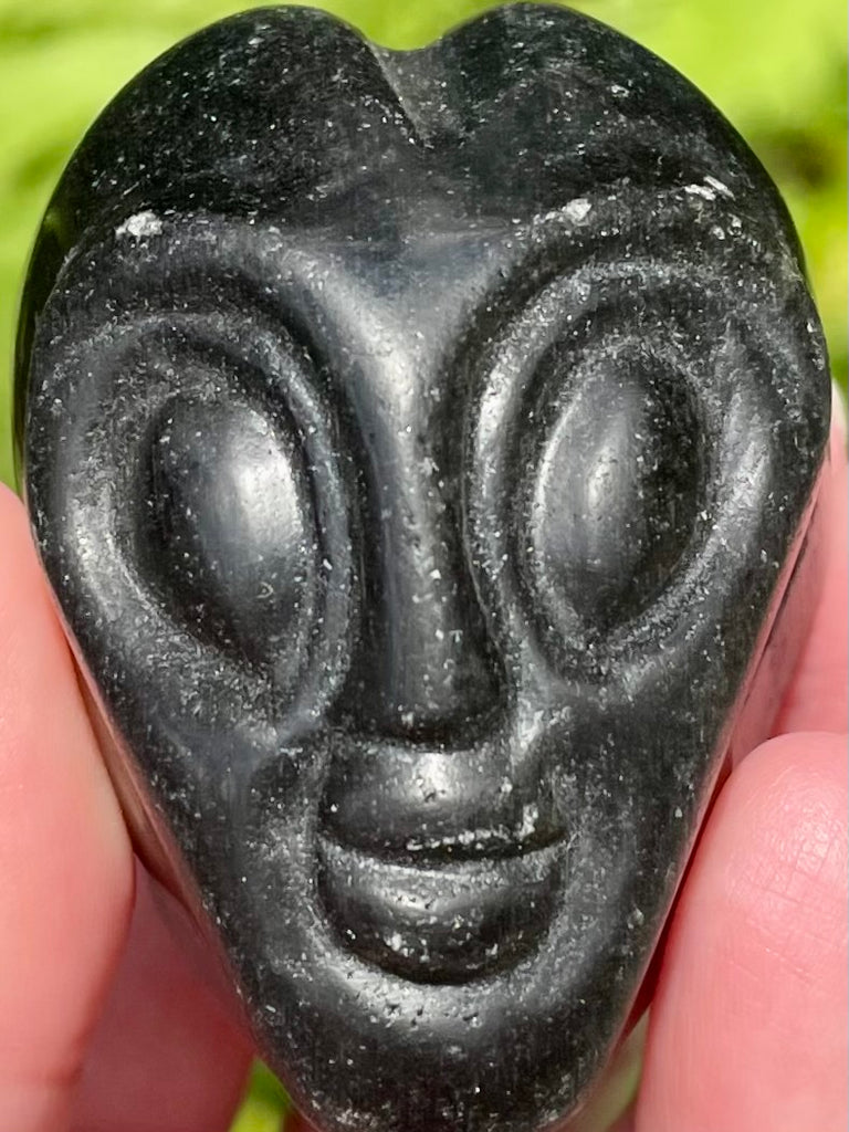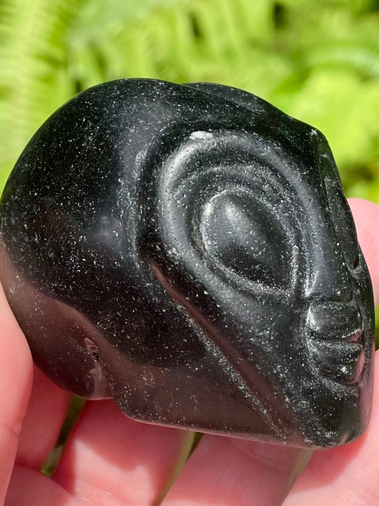 This Obsidian Alien Skull is here to offer otherworldly protection and guidance. Obsidian is a powerful cleanser for your aura and it is a strong psychic protection stone. This stone has powerful metaphysical properties that helps to shield you against negativity. It can also be useful to stimulate the gift of prophesy. Obsidian will assist you in releasing disharmony that has built up in your daily life, including resentment, fear and anger. It is also an excellent stone to use when you are cutting ties or breaking negative attachments to people who are no longer good for you.
