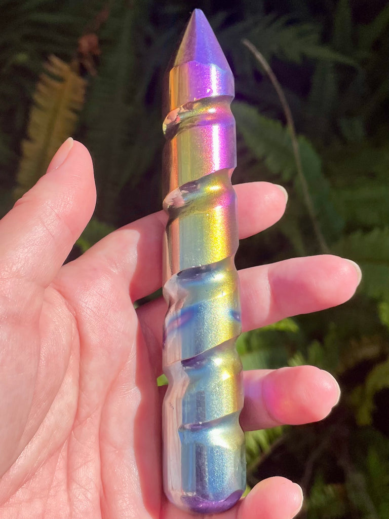 Connect to Chakra Column healing with this Rainbow Titanium Aura Selenite Spiral Wand!