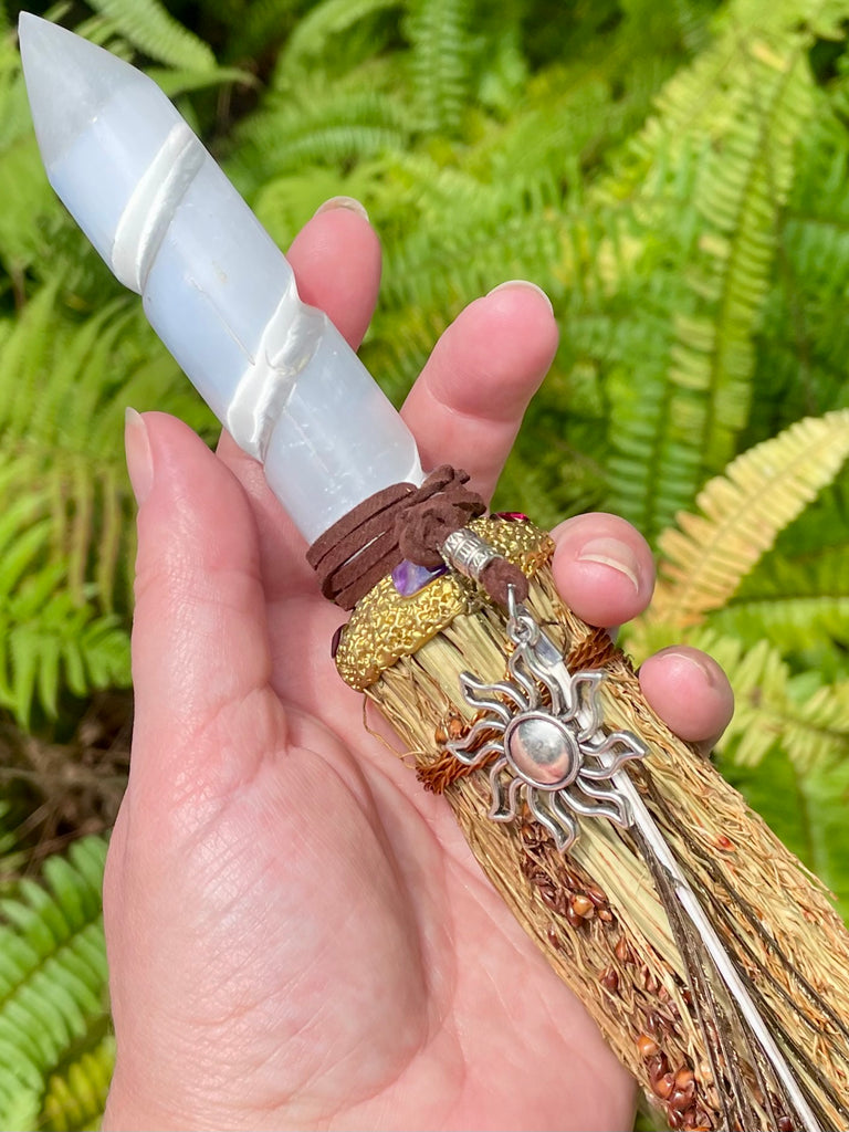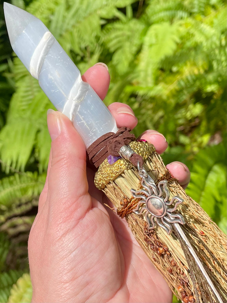 Selenite and Sorghum Altar Broom for Sweeping Away Negative Energy