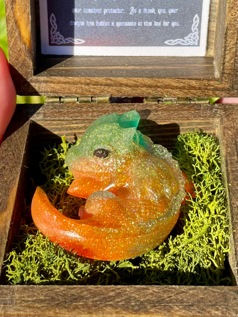 Dragon measures 1 and 1/2 inches. Dragon comes in a wooden box that measures 2.7 by 2.7 inches.