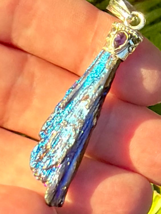 Rainbow Aura Kyanite begins as black kyanite that undergoes a superheating process where it is coated with metallic vapors from various different metallic coatings. The result is a beautiful rainbow iridescence. This stone contains all of the properties of kyanite as well as it’s own unique properties. This stone is very uplifting energetically while providing grounding energy emotionally.