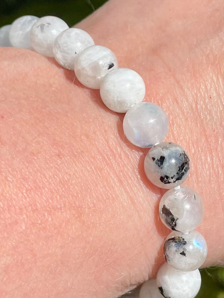Beaded bracelet stretches to 5 inches in diameter. One size fits all. Beads are 8 mm.