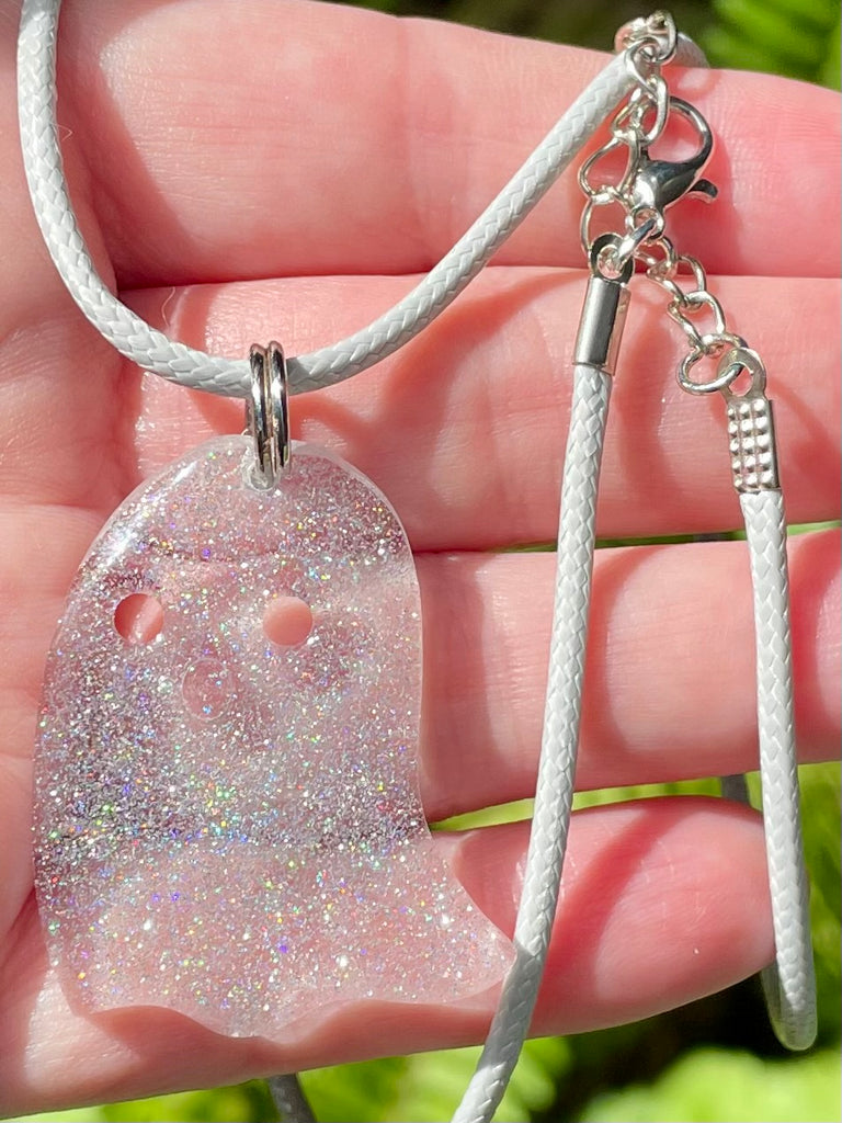 Get into the spirit of the Season with this Sparkly Ghost Resin Necklace.