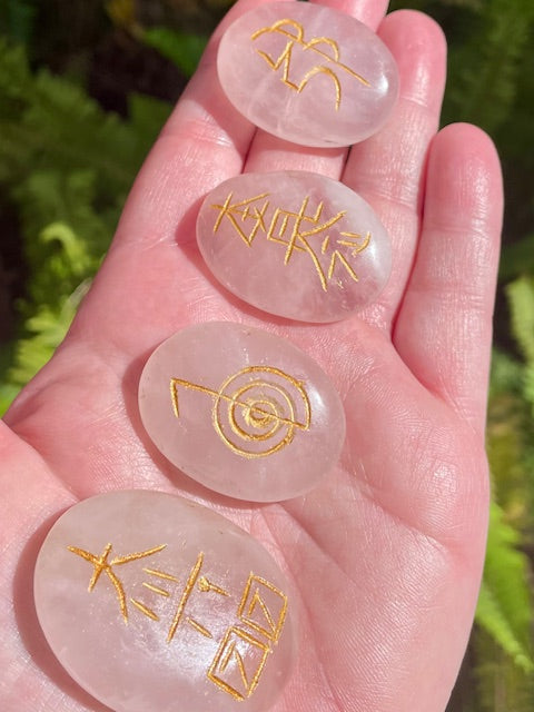 Stones measure 1 to 1 and 1/2 inches.  As each stone is unique, colors may vary. This Reiki Set uses Usui Reiki symbols.
