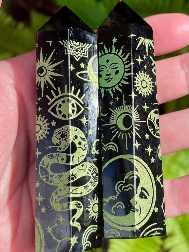 Sacred Symbols Black Obsidian Healing Wand - Gold