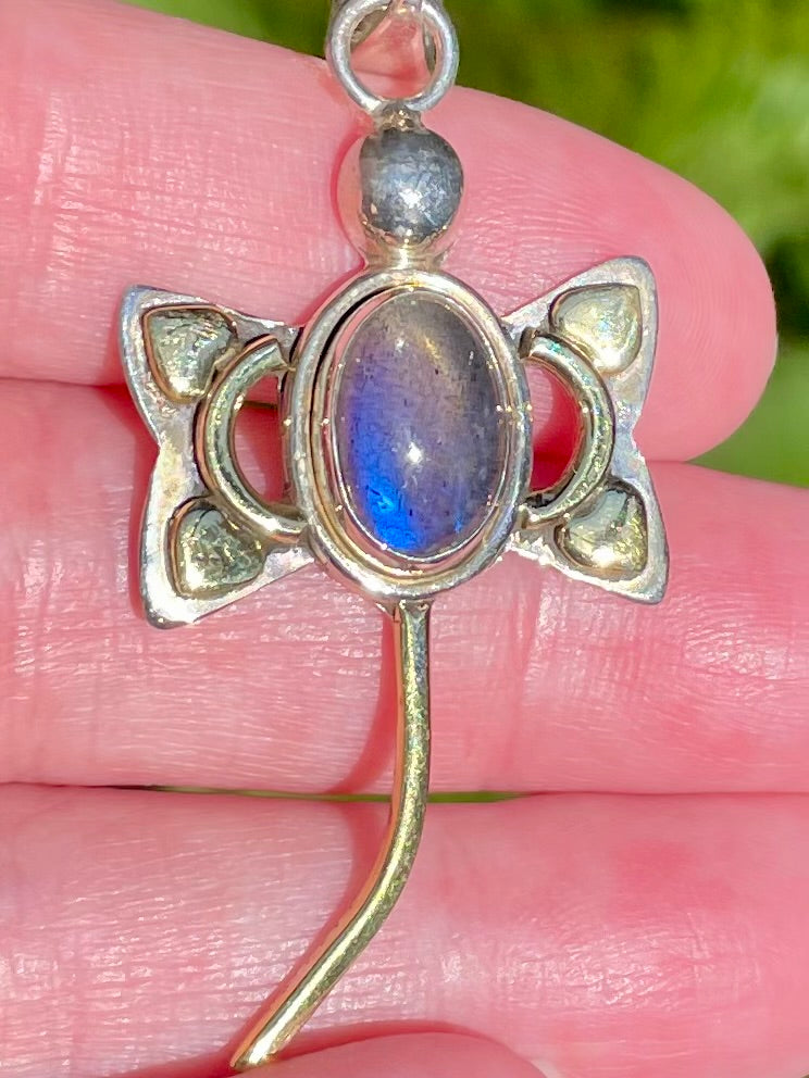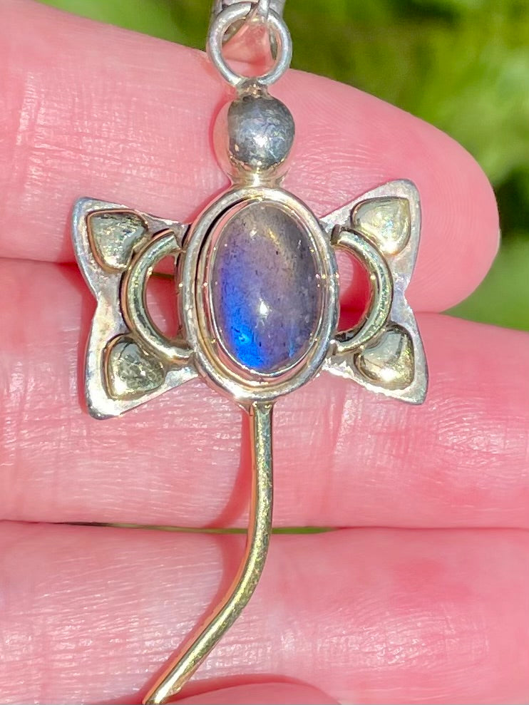 Sterling Silver pendant measures approximately 2 inches long by 1 and 1/4 inches wide.